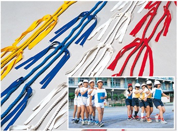 ムカデロープ F3061 5人用ムカデロープ ¥4,700+消費税 長さ1.5m F3062 10人用ムカデロープ ¥8,600+消費税 長さ3.3m ●材質=テトロン 太さ12㎜ カラー=赤(R)白(W)青(B)黄(Y) カラーご指定ください